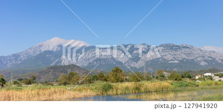 Majestic mountain range reflecting in tranquil lake surrounded by lush greenery and blue sky