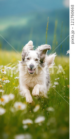Happy dog running through a vibrant meadow in springtime sunlight, AI Generative