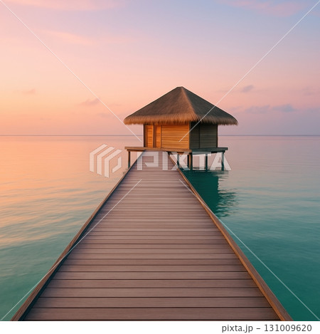 Overwater bungalow at sunset with wooden pier in tropical ocean resort