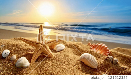 夕陽に照らされる砂浜の貝殻