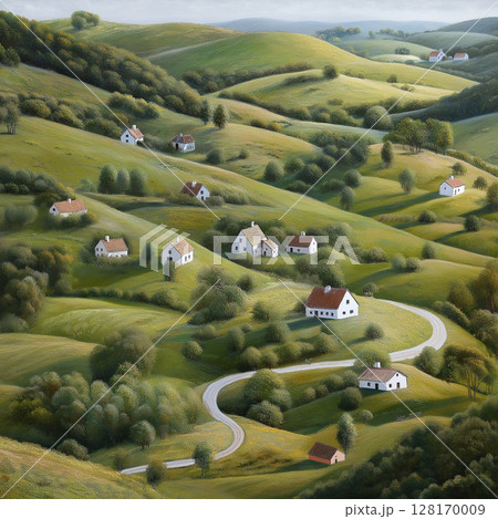 serene landscape with rolling hills and quaint houses