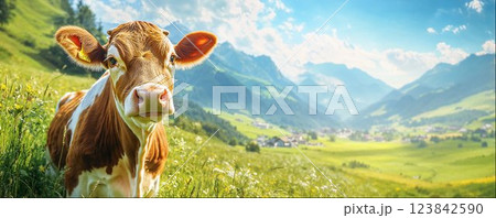 Close-up of a brown cow with Alpine meadows in the background, Swiss valley with dairy farms in the distance, advertisement template with empty copy space for your text