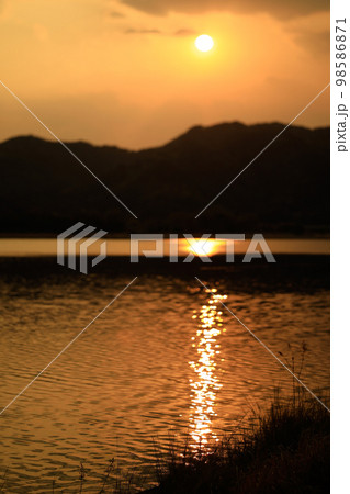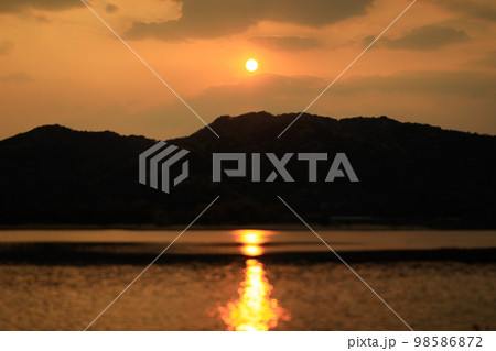 初冬の湖山池に落ちるオレンジ色の夕陽