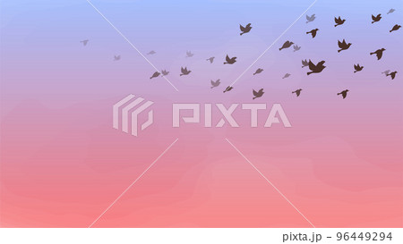 朝焼けの空を飛ぶ鳥の群れの背景イラスト