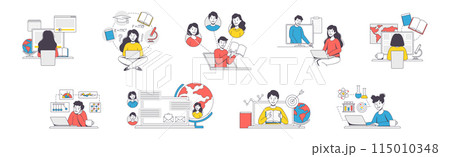 Online Learning with Man and Woman Student and Instructor Engaged in Virtual Classes Outline Vector Set