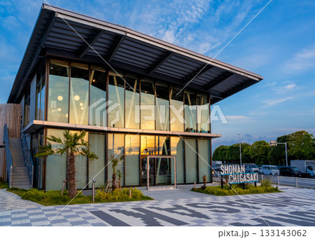 窓に夕日を反射する夕暮れ時の道の駅湘南ちがさきの様子