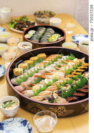 宅配 で ファミリーサイズ の お寿司 が 届く 【 デリバリー グルメ の イメージ 】
