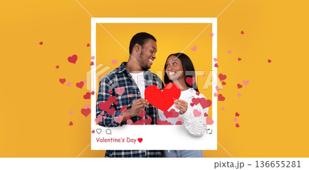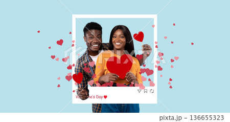 A couple is standing together, smiling and holding heart shapes for Valentine's Day. They are surrounded by heart decorations and a vibrant backdrop. The mood is festive and joyful.