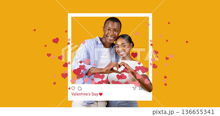 Two people make a heart shape with their hands on Valentine's Day. The background features a bright yellow color with heart graphics. They smile happily, showing their affection.