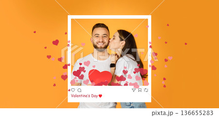 A couple enjoys Valentine's Day together. They stand against a warm orange background. Hearts surround them. The woman leans in for a kiss while the man smiles. They wear matching shirts.