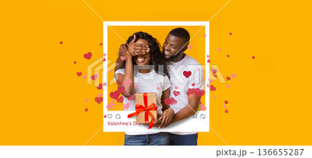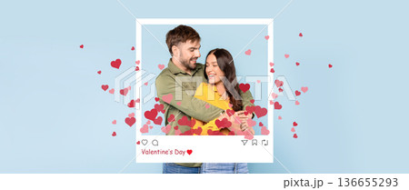 A couple embraces while smiling at each other. They are framed by a collage design with floating hearts. The setting shows celebration for Valentine's Day.