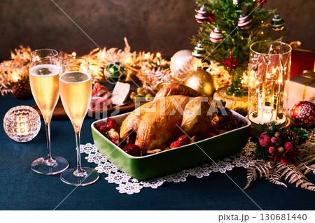 クリスマスの食卓 ローストチキンとシャンパンで乾杯