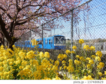 神奈川県三浦市河津桜並木脇を走る京急ブルースカイトレイン