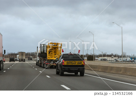 Truck carrying an oversized load is being escorted by safety vehicle on busy American highway
