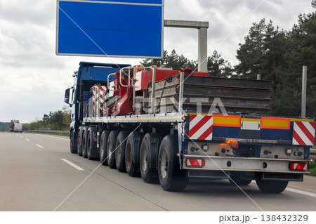 A modern truck with a lowboy semitrailer transports large-sized equipment. Copy space for text, industry
