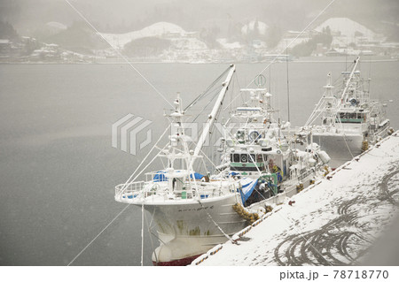 宮城県気仙沼港 雪と船 繋留、係留 船舶 海 水面 海面 反射 曇り 屋外 観光 機械