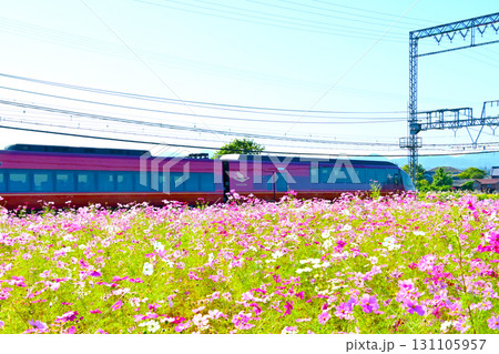 コスモス畑沿線を快走するメタリックレッドのひのとり