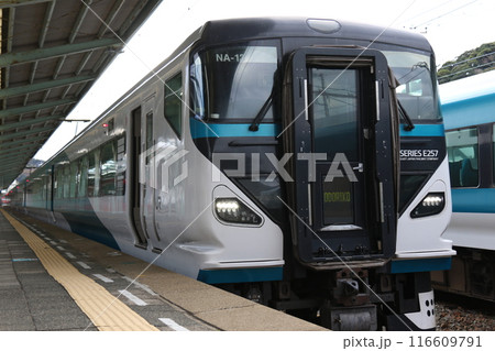伊豆急下田駅に停車中の「JR東日本E257系電車」