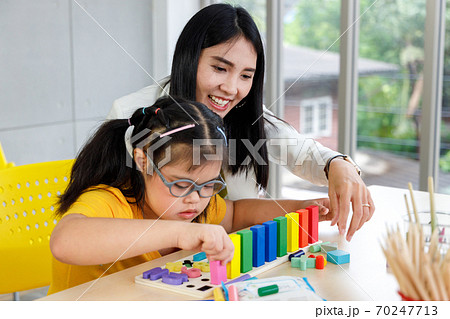 Asian girl with Down's syndrome play toy with her teacher in classroom. Concept disabled kid learning.