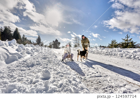 そりでプレゼントを運ぶ若い家族とペット