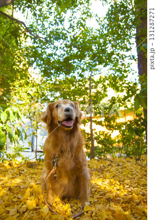 イチョウの落ち葉に包まれて座るゴールデンレトリバー