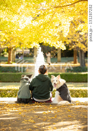 イチョウ並木と犬 お散歩イメージ 公園 シェルティ シェルティー 秋