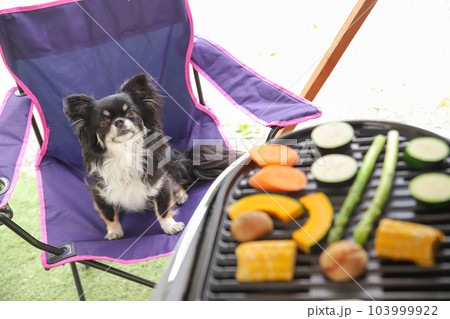 折りたたみチェアに座ってバーベキューを楽しむ犬