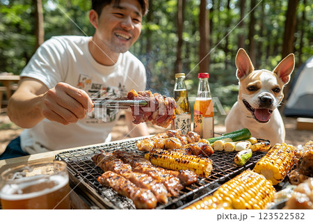 バーベキューを楽しむ男性と犬のアウトドア時間