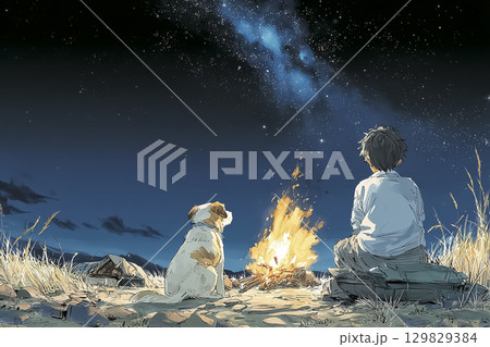 秋の夜、焚き火を見つめる犬と子どもの温かなキャンプ風景