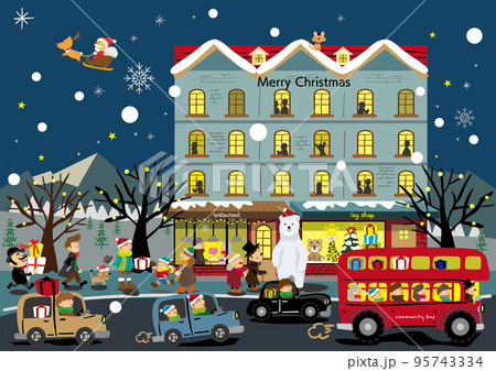 クリスマスの夜まちと行き交う人々の楽しくてかわいいイラスト(文字なし)
