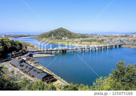 犬山城の天守閣から見た「犬山頭首工ライン大橋」(愛知県犬山市)
