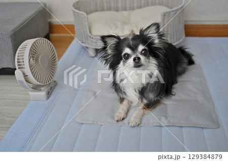 クールマットと扇風機で涼む高齢犬 チワワ 夏素材