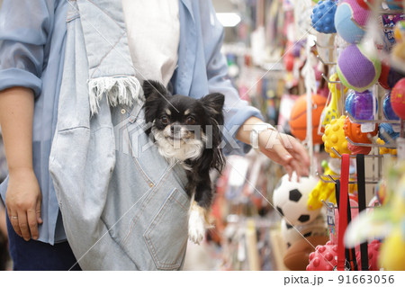 ペットショップでお買い物をする飼い主とその愛犬のロングコートチワワ