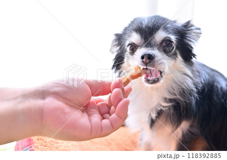 飼い主の女性から歯磨きガムをもらう犬のアップ チワワ