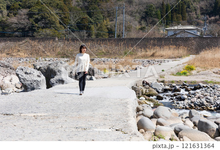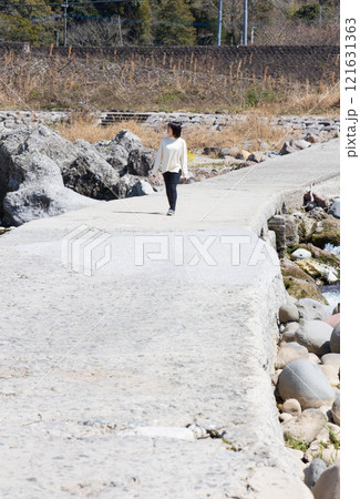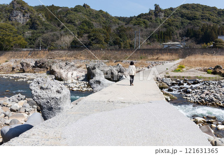 犬石犬走りの景にある沈下橋の上に立つ女性