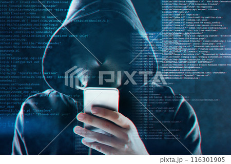 Cyber security, smartphone and hacker, internet web technology and man for online cybercrime. Data protection, secured and website access, programming virus in system and person with hoodie coding