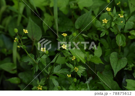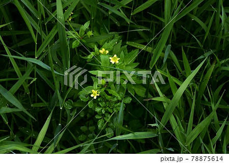 春の野の草・レンゲソウに押され気味に春の田の端に咲いているキツネノボタンの花と若い実・横位置
