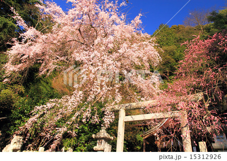3月京都 大豊神社・鳥居と紅枝垂梅と枝垂桜