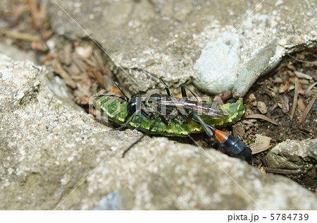ジガバチが幼虫の餌になるイモムシを狩っているところ