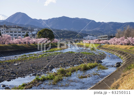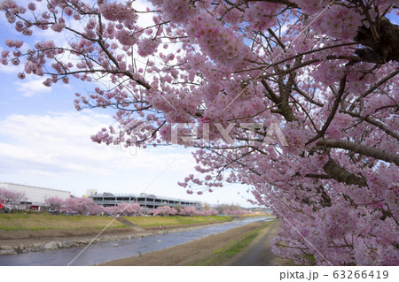 日本の春 神奈川県南足柄 狩川沿い 春めき桜の並木道