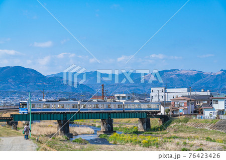 神奈川 南足柄市 狩川橋梁と大雄山線の春の風景