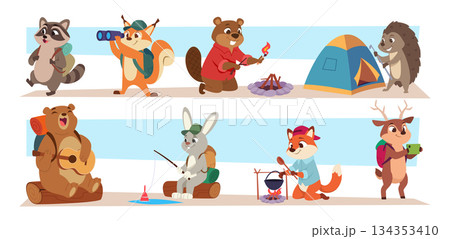 Animals outdoor. Hiking animals exploring forest exact vector characters hiking