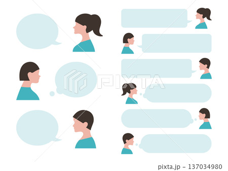 横顔シルエットの女性と吹き出しのシンプルなイラスト素材セット