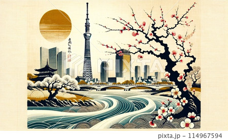 現代の錦絵:東京の風景と桜の調和スカイツリー