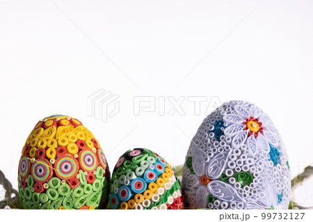 In the foreground are Easter eggs made by hand from paper and in the background is a pure white background.