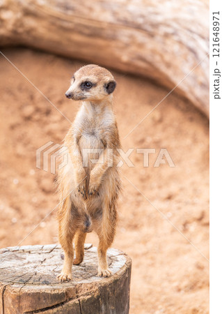 Meerkat, Suricata suricatta, on hind legs. Portrait of meerkat standing on hind legs with alert expression. Portrait of a funny meerkat sitting on its hind legs.