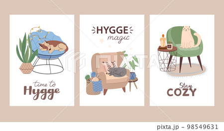 Cozy hygge cards with sleeping pets. Illustrations with animals resting in easy chairs and cute lettering. Vector posters in flat style