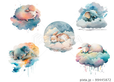 Sheep, koala, hare and elephant sleep on a cloud in watercolor style. Isolated vector illustration