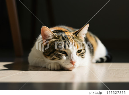 日だまりでくつろぐ三毛猫のアップ(AI生成画像)