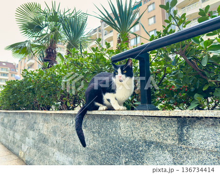 Black and white cat sitting on a stone wall near green plants in a residential area during a cloudy day
